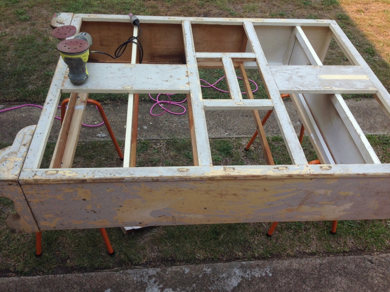 I was excited because I was sure it was finally time to paint now, and really we were almost finished then weren’t we? But no, first we had to fill all the cracks, chips and flaws with acrylic wood filler, as well as sanding the edges and corners and tricky bits by hand. We also had to cut the new shelves to size which we measured using the original shelves.